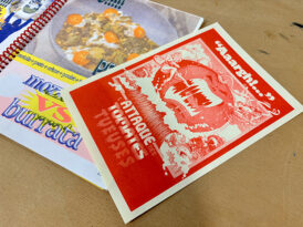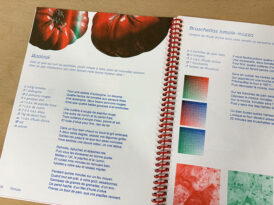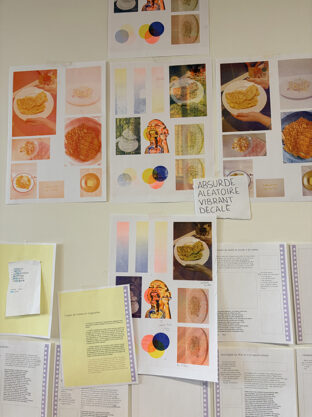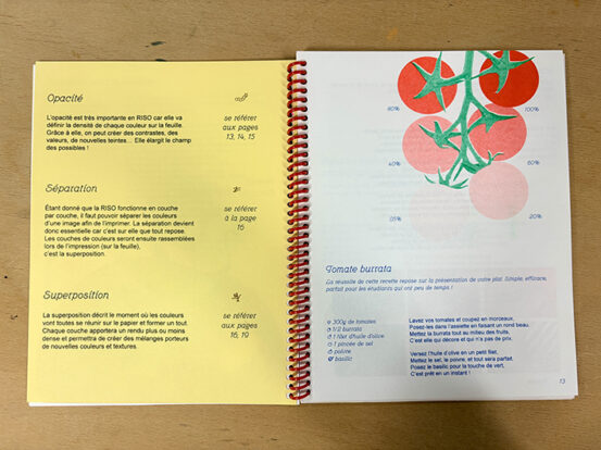 L’objectif de ce workshop était d’aboutir à une micro-édition, mettant en parallèle guide riso et livre de recettes estudiantines. Les étudiants ont donc été répartis en six groupes, chacun s’ayant vu attribué un aliment (pâtes, riz, lardons, courgettes, tomates et œufs), et une trichromie. L’occasion de se familiariser avec une pratique plus pointue de la risographie, et de travailler en groupe des principes éditoriaux forts.
