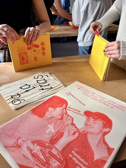 Issu d’un mécénat de la société Riso France, ce workshop de quatre jours a été encadré par Mari Campistron, éditrice et imprimeuse Riso, avec les trois années de DNMADE Graphisme.